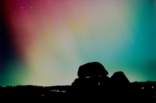 Stendyssen i Sønderskov øst for Sønderborg henligger normalt i mørke. Her udfolder naturen dog et lysshow i form af nordlys over dyssen. Fot.: Kim Christensen