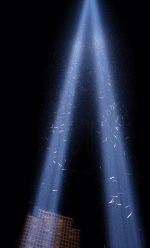 Fugle, som er tiltrukket af projektørlyset på Ground Zero, New York, USA til minde om angrebet 11. september 2001.