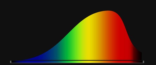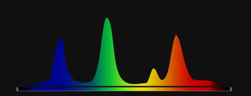 Lysstofrørs spektrum. Det fremgår, at lysstofrøret ikke udsender så meget lys i den røde og infrarøde del af spektret.
