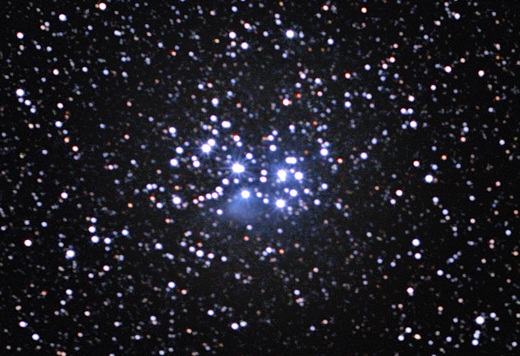The Pleiades, also known as the Seven Sisters, is an open cluster of stars located approximately 440 light-years away towards the constellation of Taurus (The Bull), making it the nearest star cluster to Earth. The cluster’s central region spans about eight light-years, with the diameter of the Pleiades as a whole estimated at 43 light-years. The Pleiades is a very prominent sight to the unaided eye during winter in the Northern Hemisphere, while in summer the cluster is best seen by observers in southern latitudes. Most of the cluster’s members are very young, hot blue stars formed within the last 100 million years. So far, about 1,000 stars have been confirmed. The hint of bluish nebulosity around the brightest stars originates from a cloud of interstellar gas and dust that the cluster is passing through at the moment. The tiny particles of dust scatter the blue light from the nearest stars more favourably than other colours, so the region appears to twinkle in blue. The cluster contains many brown dwarfs, or failed stars. These objects, though more massive than planets, do not possess enough mass to ignite nuclear fusion reactions in their cores and burst into life as bright stars. Cultures all over the world have marvelled at the Pleiades since early times, including the Maori from New Zealand, the Persians, the Indians, the Chinese, and the Maya and the Aztec in Central and South America. The Japanese call the Pleiades Subaru. Of the many ancient references to this remarkable and dazzling star assembly, among the most notable are those of the ancient Greek poets Hesiod and Homer, who included the Pleiades in his epic poems the Iliad and the Odyssey circa 750 BC. The Bible also contains three mentions of the Pleiades. The French comet hunter Charles Messier determined the position of the cluster and included it as the entry number 45 (Messier 45) in his famous catalogue from 1771.